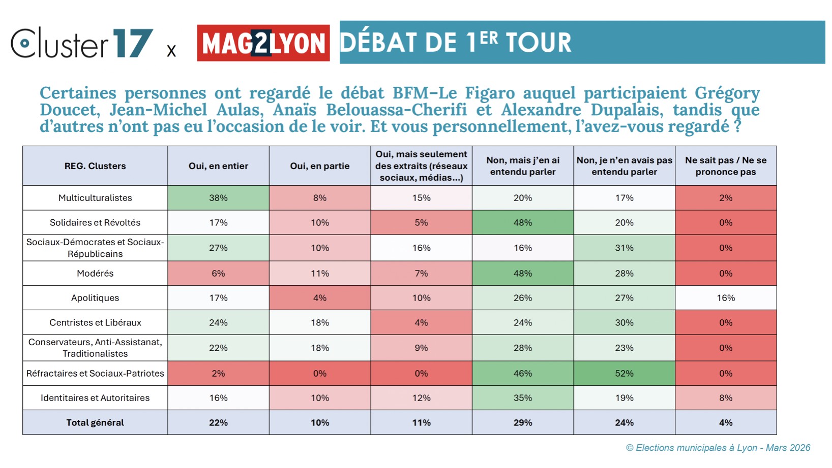 Ce qui rejoint aussi ce que j’ai dit précédemment sur l’électorat modéré, c’est que visiblement, c’est dans cet espace électoral des sociaux-démocrates qu’on assiste au plus de déplacements de votes après ce débat. Un électorat charnière qui pourrait voter pour Doucet ou pour Aulas. Dans ces groupes là, on a visiblement eu des électeurs qui ont basculé soit suite au débat lui-même, soit aux suites de ce débat et à la diffusion du jugement sur le débat. C’est-à-dire ce qu’ont pu leur en dire des proches qui l’ont vu ou qui ont vu des échos sur les réseaux sociaux. Des effets directs ou indirects sur l’ambiance électorale. Là aussi, on parle du déplacement de quelques points seulement mais cela suffit à changer la physionomie d’une élection. Mais ces électeurs modérés qui basculent, modifient le scénario et rééquilibrent cette élection municipale à Lyon.