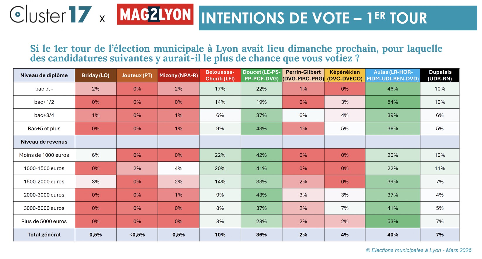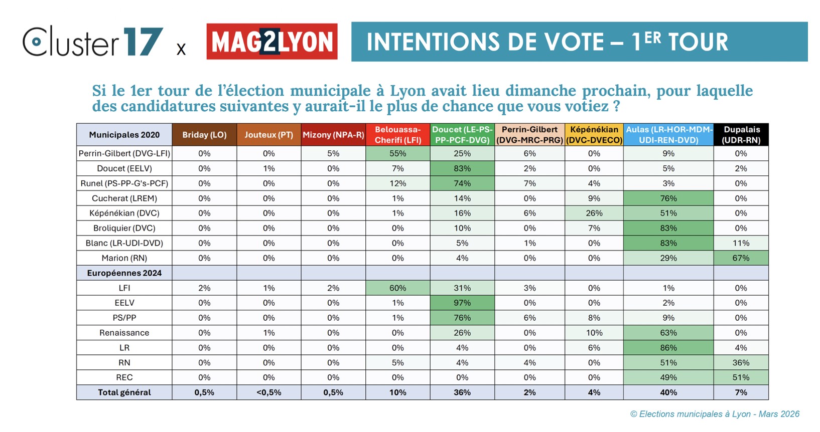 Tout d’abord un phénomène classique quand on approche du vote : on assiste à une polarisation des votes entre les deux principaux candidats. Cette polarisation est particulièrement marquée pour cette élection municipale à Lyon : selon ce sondage Cluster17 pour Mag2Lyon, plus de trois quarts des Lyonnais (76%) s’apprêtent à voter pour l’un des deux principaux candidats.
