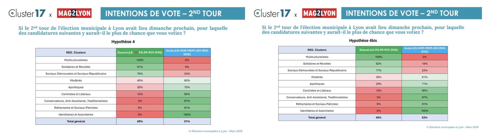 Les Multiculturalistes votent beaucoup pour Doucet mais une partie vote pour la France insoumise. Chez les Solidaires et les Révoltés, LFI est même en tête, en tout cas au 1er tour. En effet, au 2nd tour, il y a un bon report de ces voix de gauche vers Grégory Doucet en cas de duel face à Jean-Michel Aulas.