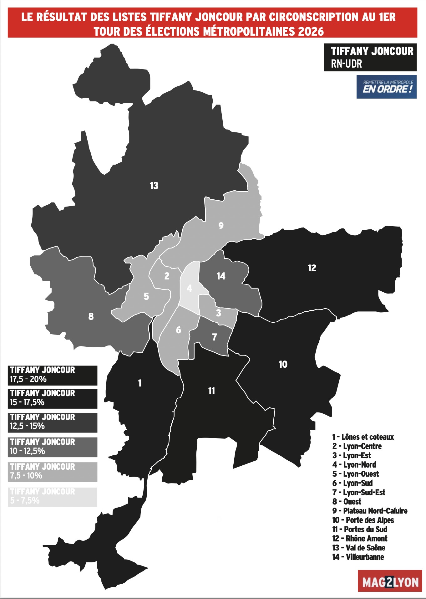 En emportant 4 circonscriptions sur 14 au 1er tour de ces élections métropolitaines, Grand Cœur Lyonnais a obtenu 37 sièges des 43 sièges à pourvoir car la règle de répartition des sièges favorisent la liste arrivée en tête. Ce n’est pas une élection à la proportionnelle. L’Union de la gauche et des écologistes n’a donc obtenu que 4 sièges et Métropole en ordre (RN-UDR) 2