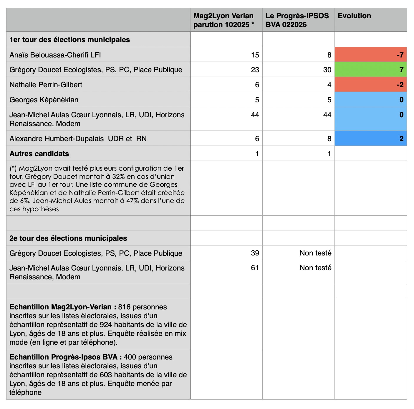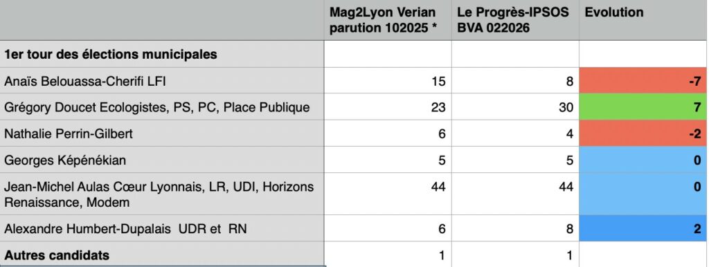 Même si le sondage du groupe EBRA-Le Progrès paru aujourd’hui a été réalisé avec un échantillon plus faible (400 personnes inscrites sur les listes électorales) que celui de Mag2Lyon d’octobre (816 personnes inscrites sur les listes électorales) et qu’il reste moins complet avec l’absence de 2nd tour, on peut tenter quelques comparaisons.